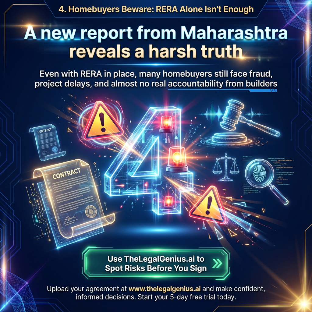 A new report from Maharashtra reveals a harsh truth: Even with RERA in place, many homebuyers still face fraud, project delays, and almost no real accountability from builders. Orders are issued, but enforcement is slow — and by the time action starts, your money, time, and peace of mind are already at risk. So how do you protect yourself before things go wrong? 👉 Use TheLegalGenius.ai to Spot Risks Before You Sign Just upload your builder agreement, sale deed, or real estate contract, and the AI instantly: You can also get your agreement reviewed by our legal team, enhanced by TheLegalGenius.ai — giving you clear, practical guidance before you commit. Don’t React to Fraud — Prevent It Your home and your investment start with a contract you fully understand. Avoid the risk before it happens. Upload your agreement at www.thelegalgenius.ai and make confident, informed decisions. Start your 5-day free trial today.